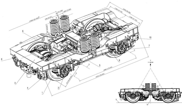 La configuration des bogies de la locomotive est basée sur un concept éprouvé de BT utilisé à grande échelle depuis 1980. Contrairement à un grand nombre de locomotives nord américaines, la caisse de la locomotive ne repose pas sur une traverse pivot, mais est plutôt soutenue sur chaque bogie par 4 ressorts hélicoïdaux Flexicoil avec ressorts extérieurs et intérieurs. Ces ressorts se déforment verticalement sous le poids de la locomotive et travaillent en cisaillement aussi bien latéral que longitudinal au cours de la rotation du bogie, et aide celui-ci à reprendre son orientation normale à la sortie d'une courbe ().