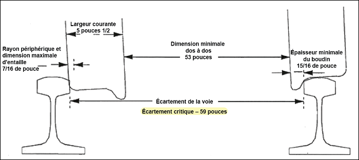 Quand l'écartement sous charge dépasse la limite critique de 59 pouces, définie par la dimension physique d'un essieu monté standard usé d'un wagon de marchandises, une roue tombera entre les rails ().