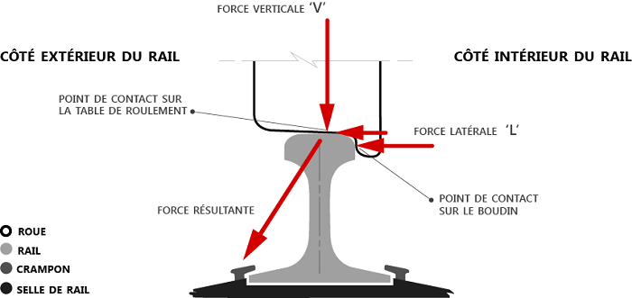 Le rapport latéral/vertical (rapport L/V) exprime le rapport qui existe entre la force de la poussée exercée par le boudin de roue vers l'extérieur du rail (effort latéral) et la charge générée par les roues sur le rail (effort vertical). On peut se servir du seul rapport L/V pour prévoir le risque qu'une roue chevauche le côté intérieur d'un rail ou se soulève d'un rail (). De façon similaire, les forces combinées provenant des roues d'un côté du bogie et exerçant des efforts latéraux élevés sur le même rail peuvent entraîner une déflexion du champignon de rail, une inversion de l'inclinaison du rail ou un déplacement latéral, ce qui donnerait lieu à un surécartement ou un renversement du rail. Les lignes directrices de l'AAR indiquent que les valeurs L/V d'un côté du bogie ne devraient pas dépasser 0,6.