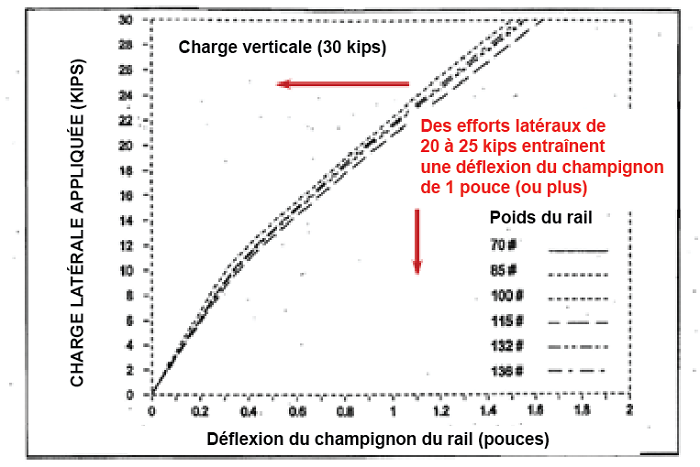 Les essais ont également montré que la déflexion du champignon du rail est relativement insensible à la taille (poids) du rail. Cependant, dans le cas d'un rail à champignon chanfreiné, dont la rigidité latérale est plus faible, la déflexion du champignon est plus grande que pour les autres types de rail. Avec des charges verticales de 30 kips, un rapport L/V de 0,7 génère des charges latérales de 21 kips, ce qui peut provoquer des déflexions du champignon du rail d'environ 1 pouce ().