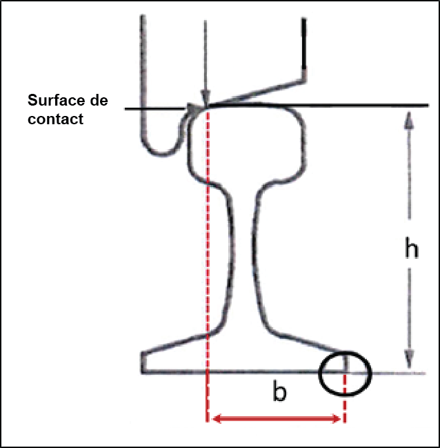 Dans des conditions normales, le contact entre la roue et le rail se produit au congé de roulement intérieur du champignon du rail. Quand la charge générée par les roues se déplace vers le côté extérieur, b diminue et b/h diminue. Par conséquent, le rapport L/V diminue aussi, ce qui entraîne un risque accru de renversement du rail. Le rapport b/h peut varier de plus de 0,6 pour un contact sur le côté intérieur à environ 0,2 quand la surface de contact se trouve sur le côté extérieur opposé.