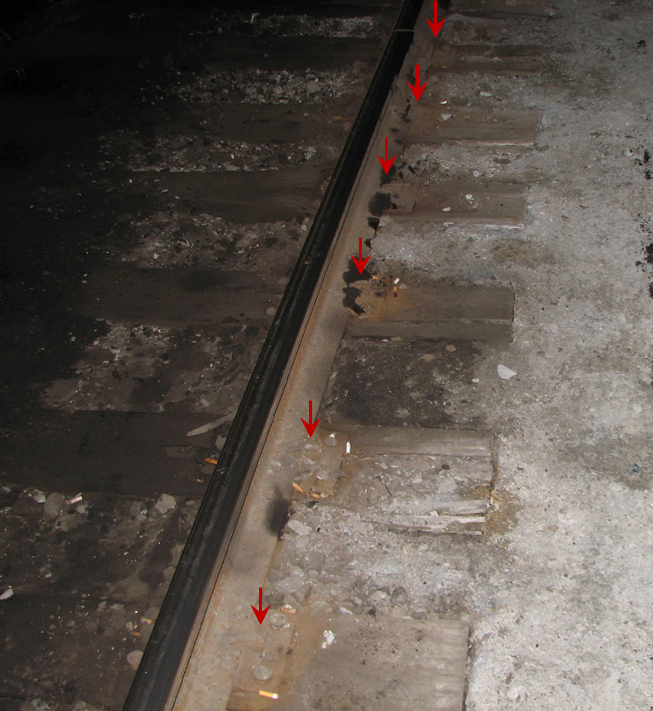 À la fin de la courbe, l'écartement sans charge mesuré était d'environ 57 ¼ pouces. Cependant, en raison de l'état de la fixation des rails, c'est-à-dire l'usure et la corrosion des crampons à section arrondie, les trous de selle élargis et l'intervalle entre le patin du rail et les épaulements des selles, l'écartement de la voie a pu atteindre 57 15/16 pouces , même sous une charge latérale relativement faible. Le soulèvement des crampons sur le rail nord indique que le rail s'est renversé quelque peu. L'importance du soulèvement des crampons (jusqu'à 1 pouce) a entraîné un déplacement du champignon du rail de plus de 1 pouce, l'écartement s'approchant donc de la valeur critique de 59 ½ pouces, ce qui a causé la chute des roues entre les rails.