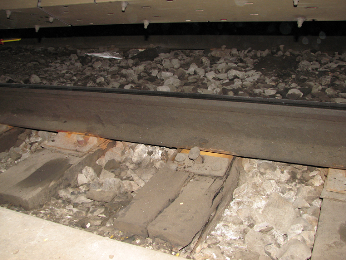 La voie ne comporte pas d'anticheminants. Le ballast est constitué de gravier concassé (diamètre de 1 à 2 pouces); à certains endroits, il est obstrué par de la graisse et de la boue (photos 7 et 8).