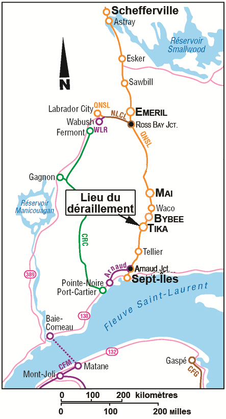Le 26 septembre 2011, vers 6 h 15, heure avancée de l'Est, 17 wagons chargés de minerai du train PL 485 du Chemin de fer QNS&L ont déraillé au point milliaire 56,33 de la subdivision Wacouna, près de Tika (Québec). La voie principale a été endommagée sur une distance d'environ 450 pieds et la voie d'évitement, sur environ 200 pieds. L'accident n'a fait aucun blessé et n'a causé aucun dommage permanent à l'environnement.