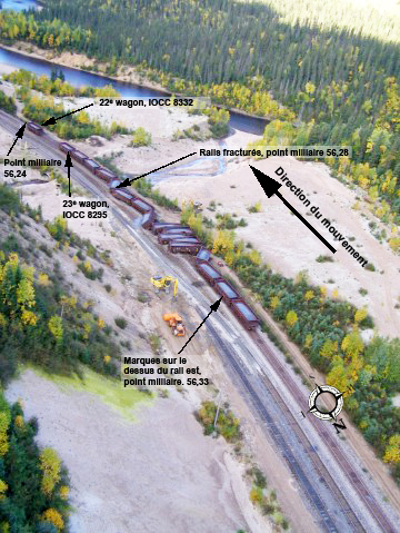 Le wagon IOCC 8332, premier wagon déraillé et 22e de la tête du train, est demeuré attelé à l'avant du train alors que les autres wagons qui ont déraillé se sont séparés du train et se sont immobilisés quelque 250 pieds plus au nord. Tous les wagons sont demeurés debouts sur la plate-forme, à l'exception du 30e wagon qui s'est renversé à 45 ° sur le côté est de la voie ferrée. Le bogie arrière du 22e wagon a déraillé. Les 7 wagons suivants, du 23e wagon au 29e wagon, ont déraillé parallèlement à la voie alors que les 6 wagons suivants, du 31e wagon au 36e wagon, ont fait une mise en portefeuille. Le 38e wagon a déraillé son bogie avant uniquement.