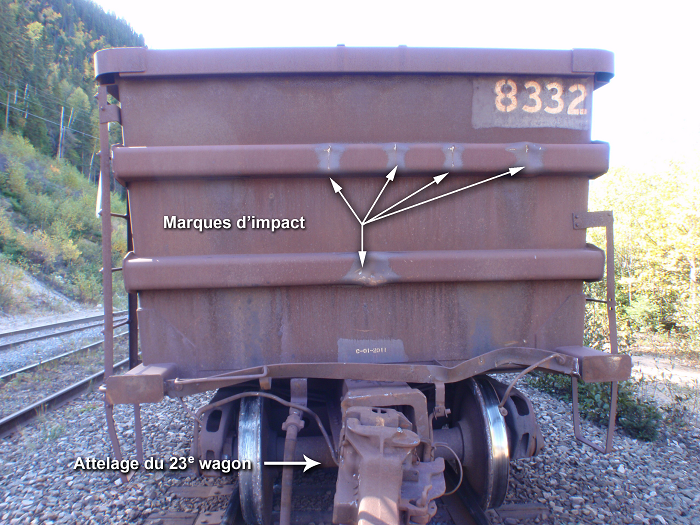 Comme la séparation du train a eu lieu vers l'avant du train et que les freins indépendants et rhéostatiques ont été appliqués après le freinage d'urgence, l'avant du train a ralenti plus rapidement que le reste du train, qui se trouvait dans une pente plus abrupte. Par conséquent, les deux parties du train sont entrées en collision, tel que le confirme la compatibilité des dommages aux extrémités du 22e wagon et du 23e wagon. Les marques d'impact observées sur le côté ouest de l'essieu et du châssis du 23e wagon suggèrent que la force de l'impact a été appliquée en angle, ce qui a amplifié l'effet de la force latérale générée lors de la collision et a entraîné le déraillement du train.