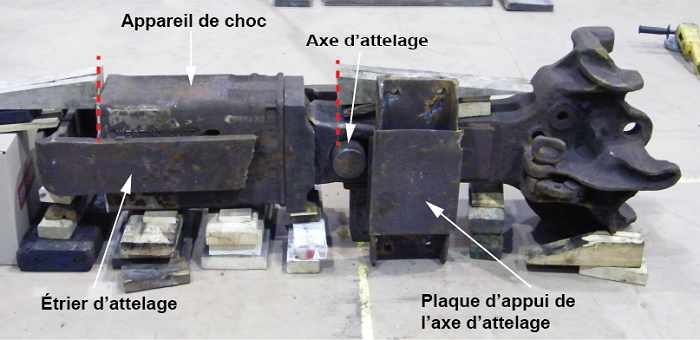 - Étant donné que la plaque d'appui de l'axe d'attelage du 23e wagon était mal positionnée et que de l'usure s'était accumulée sur les diverses composantes du dispositif d'attelage, l'axe d'attelage s'est libéré, entraînant la séparation du train.