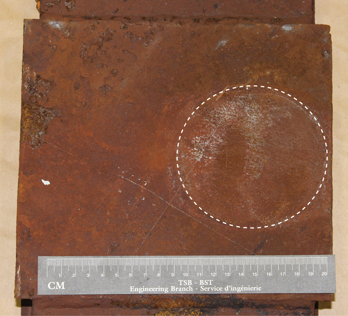 L'examen du wagon IOCC 8295 a permis de constater que les plaques d'appui étaient mal positionnées. Celle du bout B portait une empreinte de frottement (Photo 5) décentrée horizontalement d'environ 63,5 mm (2,5 pouces) et était positionnée à 6 ½ pouces de l'extrémité du wagon alors que l'axe d'attelage était à 9 pouces. Inversement, au bout A, la plaque était positionnée à 9 pouces alors que l'axe était à 6 ½ pouces.
