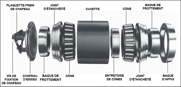 Un roulement à rouleaux (Figure 2) se compose d'une cuvette extérieure qui renferme 2 cônes pourvus de rouleaux coniques qui sont séparés l'un de l'autre au moyen d'une entretoise. Chaque train de rouleaux comporte un chemin de roulement, des rouleaux et une cage. Des joints d'étanchéité intérieur et extérieur, des bagues de frottement, une bague d'appui et un chapeau d'extrémité complètent le roulement à rouleaux. La cuvette, les rouleaux et les cônes sont trempés. En outre, les surfaces qui sont étroitement en contact les unes avec les autres font l'objet d'une opération de finition de précision. La cage joue essentiellement le rôle d'entretoise qui maintient les rouleaux en place à l'intérieur du cône. Les cages sont généralement réalisées par poinçonnage (formage à froid) à partir d'une feuille d'acier malléable à faible teneur en carbone. L'ensemble entier est calé à la presse sur une fusée d'essieu, assujetti contre le rayon du congé de raccordement de la fusée d'essieu et retenu par un chapeau fixé à l'extrémité de l'essieu par 3 vis de fixation maintenues en place au moyen d'une plaquette-frein de chapeau.