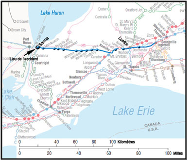 Les voies de la gare de triage Sarnia sont principalement construites avec des rails de 115 livres. Les branchements sont soit de type numéro 09 ou numéro 10 avec des appareils de manœuvre d'aiguillage de type 17B. Tous les disques d'aiguillage étaient en bon état. Le branchement numéro 09 près du point de collision est construit avec du rail de 115 livres et doté d'un aiguillage à gauche. Le branchement est muni d'une contre-aiguille Samson et les pointes avec des protecteurs. La voie à cet endroit était complètement clouée avec des traverses en bon état. En 2007, environ 80 % des traverses avaient été remplacées près du lieu de l'accident. La surface et l'écartement des rails étaient appropriés.