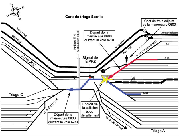 L'itinéraire de la manœuvre 0600 par la voie d'accès ouest avait été « confirmé libre » conformément aux dispositions de la règle 115 du REF, car l'équipe de la manœuvre avait déjà établi son itinéraire et elle n'avait pas été informée de l'existence d'une autre manœuvre de triage à proximité. Par conséquent, l'équipe de la manœuvre 0600 n'a pas protégé le véhicule de tête de leur mouvement avant d'entrer dans la PPZ. La collision et le déraillement subséquent se sont produits lorsque la manœuvre 0600 est revenue sur la voie d'accès ouest et que la locomotive de tête a percuté le côté de la manœuvre 0800 qui utilisait la même voie d'accès ouest pour quitter le triage A.