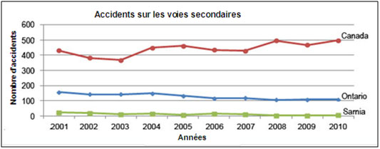Depuis 2007, le nombre total d'accidents à la gare de triage Sarnia a diminué considérablement. On n'a signalé qu'une collision au cours des 3 dernières années, ce qui est une diminution par rapport à une moyenne de plus de 5 collisions par année pour le reste de la décennie (voir la figure 3). La gare de triage Sarnia a été reconnue pour son faible taux d'accidents et avait déjà été récipiendaire d'un prix de reconnaissance de l'entreprise à l'égard de cette réalisation.