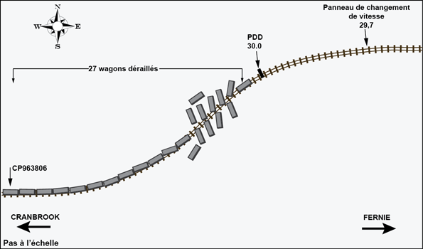 Aux environs de 5 h 15 Note de bas de page 1, alors que le train roulait à 25 mi/h, un freinage d'urgence provenant de la conduite générale Note de bas de page 2 est déclenché au point milliaire 30,5, près de Fernie, en Colombie-Britannique (Figure 1). Lors de l'inspection, le chef de train a constaté que 27 wagons avaient déraillé, en commençant par le 32e (CP 963806) pour finir avec le 58e wagon (LUSX 4797).