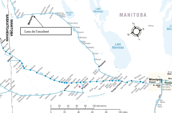 Le 29 octobre 2011 à 9 h 32 Note de bas de page 1, le train de voyageurs de VIA Rail Canada inc. (le VIA 692) quitte Canora (Saskatchewan) et roule vers l’est sur la subdivision Togo du Canadien National (CN), conformément à la feuille de libération l’autorisant à avancer Note de bas de page 2. Le train était formé de 2 locomotives et de 7 voitures-coachs. L’équipe comprenait 2 mécaniciens de locomotive Note de bas de page 3 et 6 employés des services de bord. Il y avait 55 voyageurs à bord.