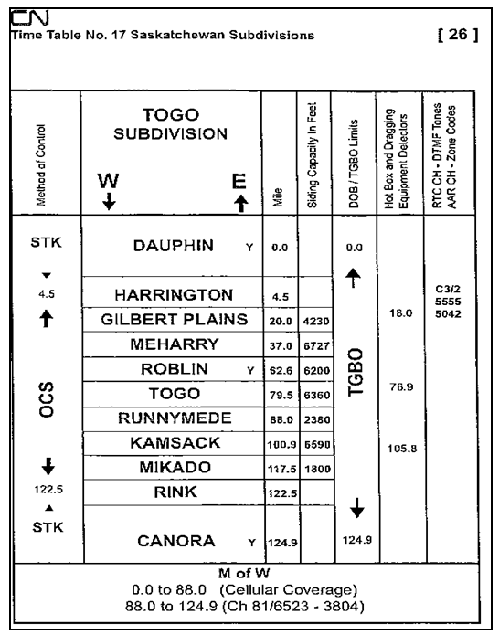 La subdivision Togo du CN s’étend d’est en ouest de Dauphin (Manitoba), point milliaire 0,0, à Canora (Saskatchewan), point milliaire 124,9. La subdivision est contrôlée par un CCF à Edmonton (Alberta). Entre Harrington (point milliaire 4,5) et le point milliaire 122,5, l’exploitation des trains est régie par la régulation de l’occupation de la voie (ROV). L’indicateur pour la subdivision Togo du CN est représenté à la figure 2.