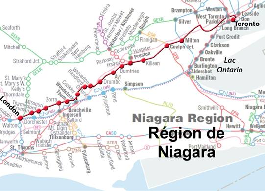 La subdivision Galt s’étend du point milliaire 0,0 (Toronto) au point milliaire 114,6 (London). Les trains qui circulent à proximité du lieu de l’accident sur la subdivision Galt sont contrôlés par le système de commande centralisée de la circulation (CCC), en vertu du Règlement d’exploitation ferroviaire du Canada (REF) et sont supervisés par un contrôleur de la circulation ferroviaire (CCF) du situé à Montréal (Québec). La subdivision comprend essentiellement une voie principale avec des limites de vitesse qui varient de 35 à 65 . Il n’y a aucun train régulier à destination ou en provenance de London sur la subdivision Galt; ainsi, les trains y circulent à des heures différentes d’un jour à l’autre.