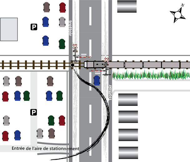 Le passage à niveau en question respecte les exigences réglementaires de Transports Canada (), et les sont tout à fait visibles aux piétons et aux véhicules qui s’en approchent sur la chaussée. L’emprise de la compagnie de chemins de fer est bordée de végétation du côté sud-est du passage à niveau. Cette végétation empêche les piétons et les automobilistes qui s’approchent de l’intersection du sud de bien voir la circulation ferroviaire se déplaçant d’est en ouest. Toutefois, la réglementation n’exige pas un champ de vision dégagé le long de l’emprise, étant donné que le passage à niveau est protégé par des .