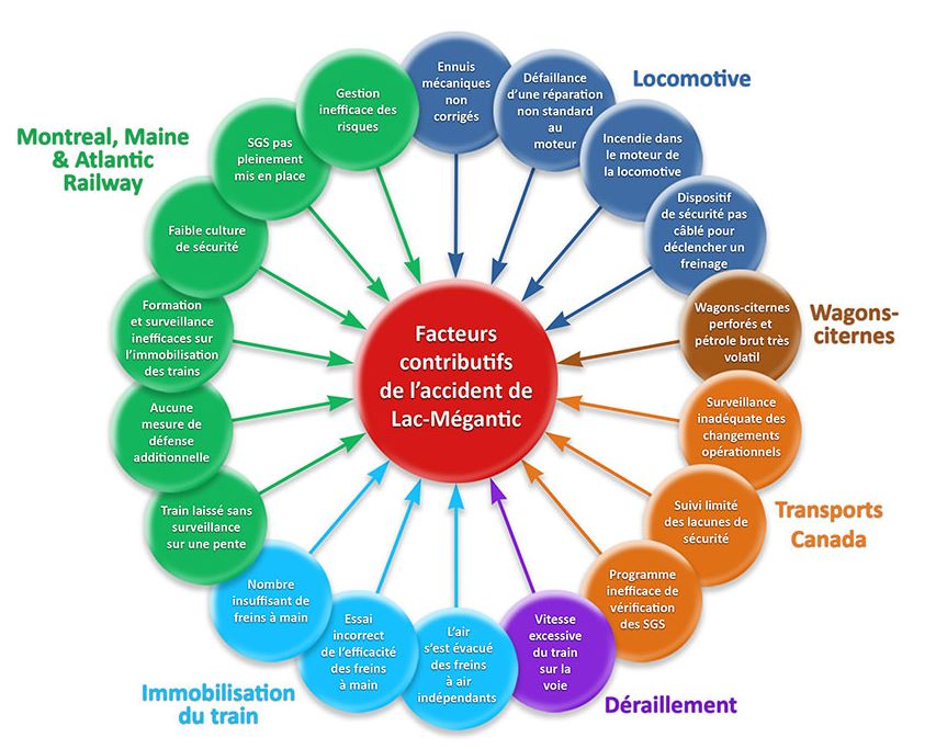 Les enquêtes que mène le BST sont complexes – un accident n'est jamais causé que par un seul facteur. Le rapport fait état de 18 faits établis distincts quant aux causes et facteurs contributifs, dont un certain nombre se répercutent les uns sur les autres.