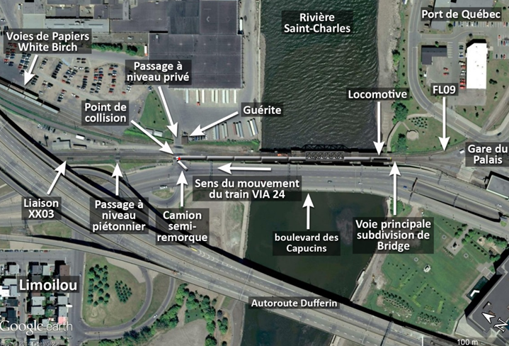 Le 2 mai 2013, vers 19 h 48, heure avancée de l'Est, le train de voyageurs no 24 de VIA Rail Canada Inc., qui exécute une manœuvre en marche arrière entre la Gare du Palais et le triage Limoilou à Québec (Québec), entre en collision avec un camion semi-remorque au passage à niveau privé menant à l'usine Papiers White Birch. La dernière voiture de voyageurs est endommagée, et le camion semi-remorque est détruit. L'accident ne fait aucun blessé. Près de 300 litres de carburant diésel provenant du réservoir du camion semi-remorque se répandent sur le sol.