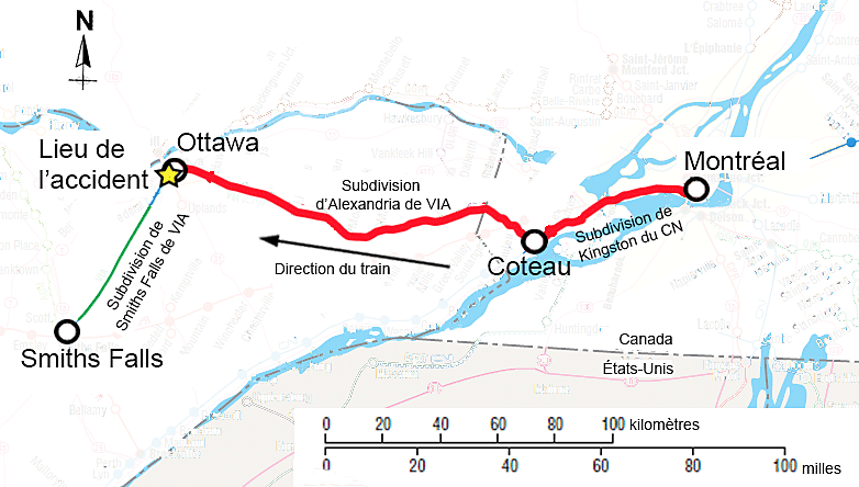 La subdivision de Smiths Falls de VIA est constituée d'une voie principale simple allant du point milliaire 0,0 (à 6,0 milles à l'ouest de la gare d'Ottawa de VIA) jusqu'au point milliaire 34,40 à Smiths Falls (Ontario). Les mouvements de train sur la subdivision de Smiths Falls sont régis par la commande centralisée de la circulation, autorisée par le Règlement d'exploitation ferroviaire du Canada (REF) approuvé par Transports Canada (TC) et supervisée et dirigée par un contrôleur de la circulation ferroviaire (CCF) de RailTerm en poste à Dorval (Québec).