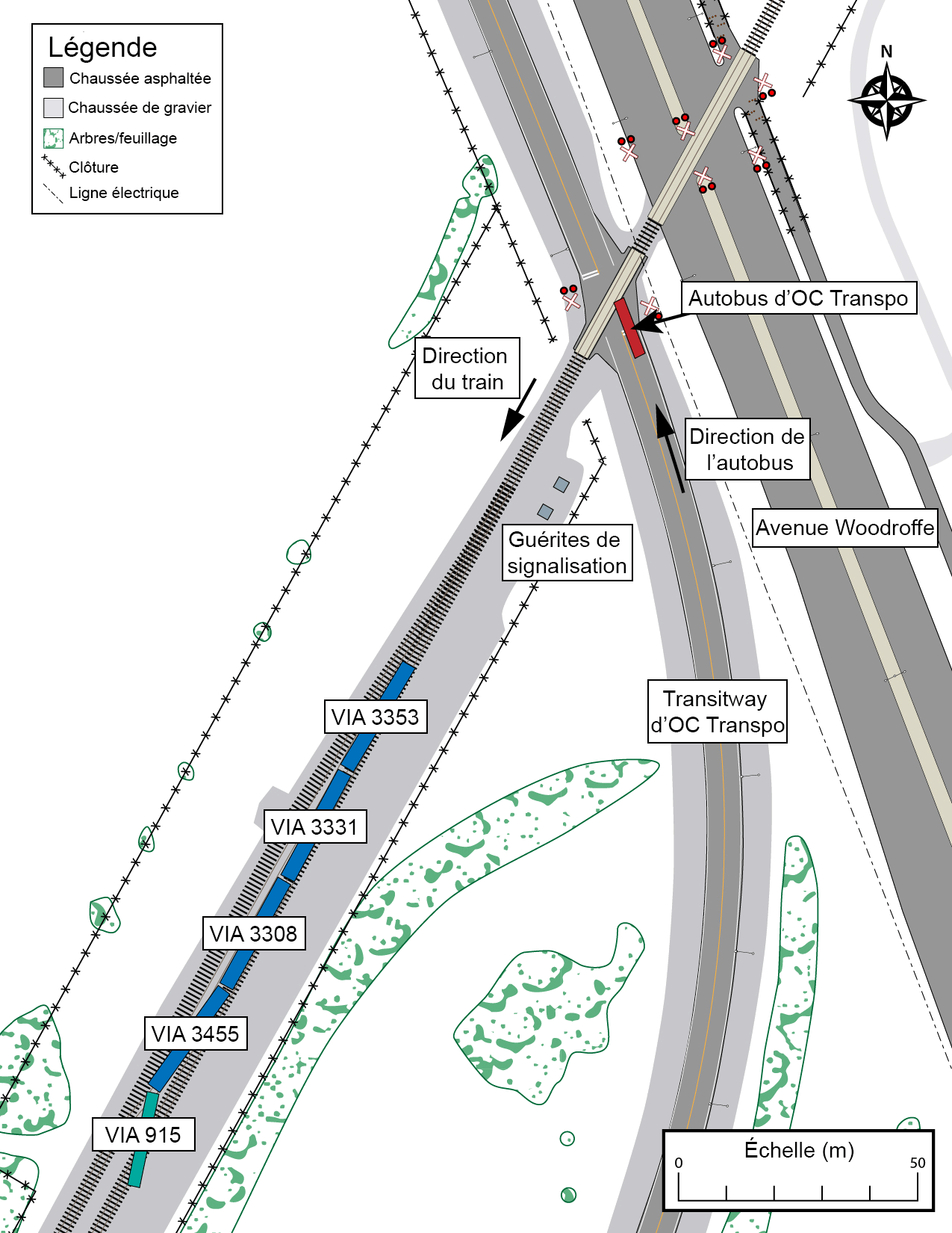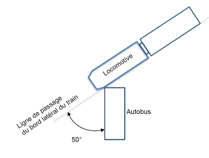 Au passage à niveau, le Transitway franchit la voie ferrée à un angle de 50 degrés. L'orientation relative de l'autobus et de la locomotive juste avant l'impact est représentée à la figure 3.