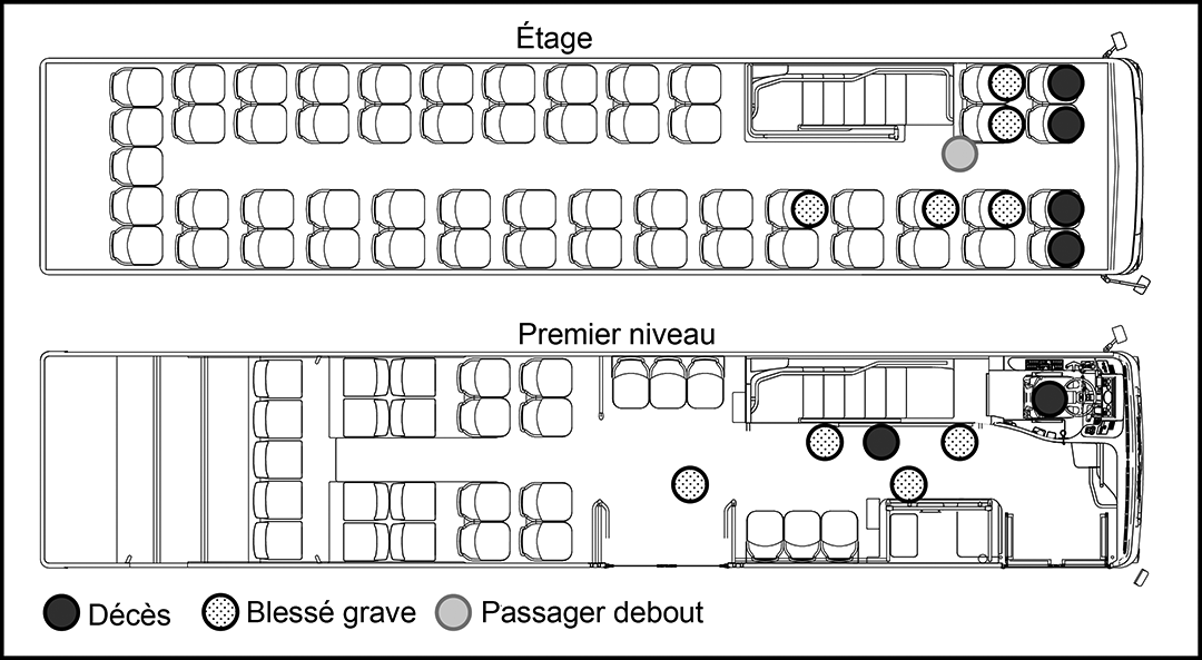 Il n'y a eu aucun blessé parmi les membres de l'équipe et les voyageurs de VIA. Parmi les occupants de l'autobus, 6 ont péri, 9 ont été grièvement blessésNote de bas de page 9, et environ 25 ont subi des blessures mineures. La position des occupants de l'autobus qui ont subi des blessures mortelles ou graves est indiquée dans la figure 5.
