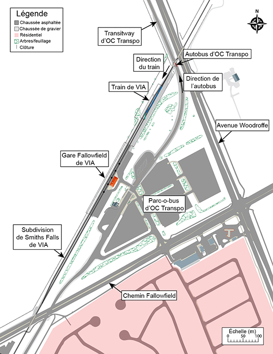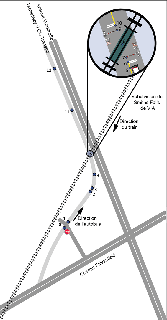 Le 18 septembre 2013, le train a quitté la gare d'Ottawa de VIA à l'heure prévue, à 8 h 31 min 57 sNote de bas de page 2, Note de bas de page 3. Son prochain arrêt était la gare Fallowfield de VIA, située à l'extrémité ouest d'Ottawa, au point milliaire 3,57 de la subdivision de Smiths Falls de VIA. Avant d'arriver à la gare Fallowfield de VIA, les trains circulant vers l'ouest doivent franchir les passages à niveau de l'avenue Woodroffe et du Transitway, situés respectivement aux points milliaires 3,28 et 3,30.