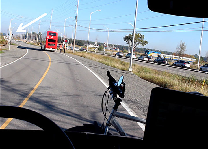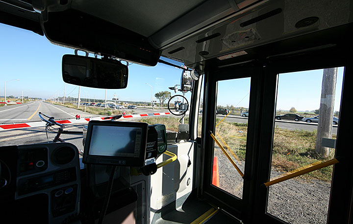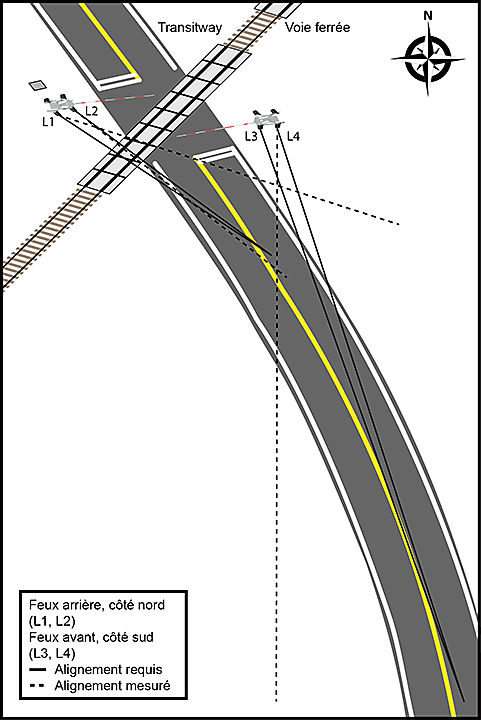 À 8 h 47 min 59 s, l'autobus a franchi le point où tous les feux clignotants rouges au passage à niveau du Transitway sont devenus bien visibles, à environ 402 pieds (122,5 m) de la barrière sud du passage à niveau.