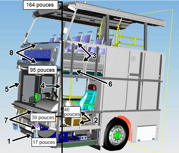 exige que tous les autobus d'un poids nominal brut du véhicule supérieur à 10 000 livres soient équipés d'un système d'enregistrement de bord qui : (1) enregistre les paramètres du véhicule, dont au moins les suivants : accélérations latérale, longitudinale et verticale, direction de déplacement, vitesse du véhicule, régime moteur, état de la ceinture de sécurité du conducteur, entrées de freinage, mouvements du volant, passage des rapports, utilisation des clignotants (gauche/droit), état des feux de freinage (allumés/éteints), état des feux avant/arrière (allumés/éteints), état des portes passagers (ouvertes/fermées), état de la porte de secours (ouverte/fermée), état des feux de détresse (allumés/éteints), état du système de freinage (normal/avertissement) et état des feux clignotants rouges (allumés/éteints, autobus scolaires seulement); (2) enregistre l'état des autres ceintures de sécurité ainsi que les critères, l'heure et l'intensité du déploiement des coussins gonflables; (3) enregistre les données à un taux d'échantillonnage suffisant pour définir la dynamique du véhicule et pouvoir préserver les données en cas de collision du véhicule ou d'une perte d'alimentation électrique; et (4) soit fixé à la carrosserie de l'autobus, et non au châssis, de façon à assurer l'enregistrement des données nécessaires à la définition du mouvement de la carrosserie de l'autobus. (H-10-007)