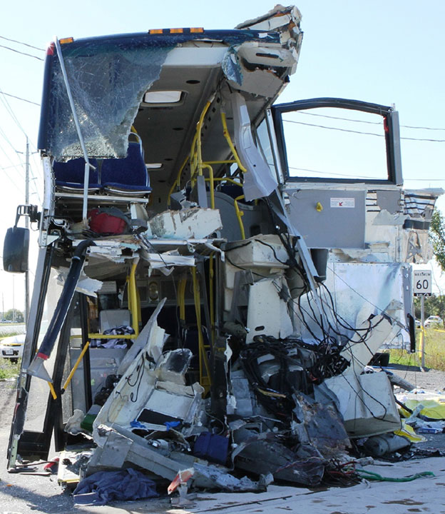 L'avant de l'autobus était effondré et arraché. Les débris de l'autobus se sont principalement retrouvés sur le côté ouest de la chaussée et parallèlement à l'emprise ferroviaire sur une distance d'environ 100 pieds (30 m) le long de la voie ferrée dans le sens de déplacement du train.