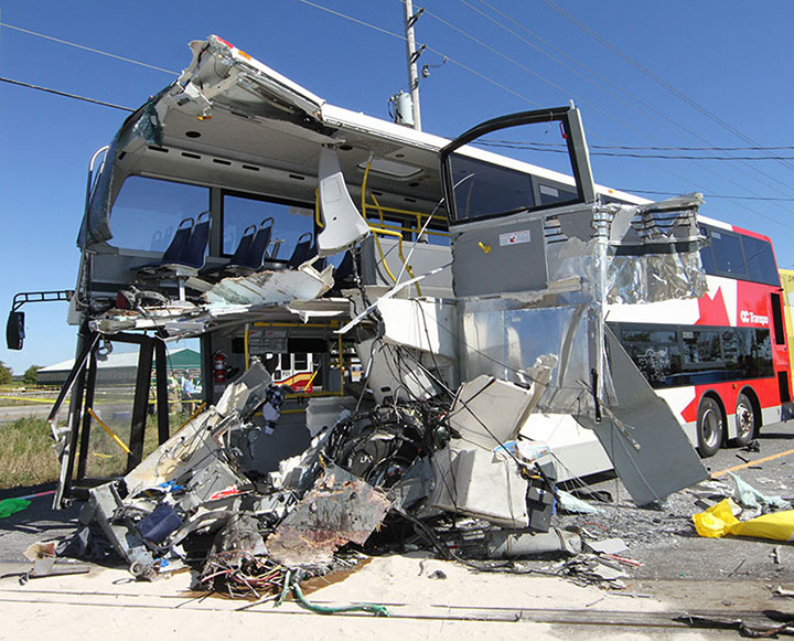 Le 18 septembre 2013, vers 8 h 32, heure avancée de l'Est, le train de voyageurs no 51 de VIA Rail Canada Inc. (VIA), circulant vers l'ouest, a quitté la gare d'Ottawa de VIA à l'heure prévue en direction de Toronto (Ontario). À 8 h 47 min 27 s, l'autobus à 2 étages no 8017 d'OC Transpo a quitté la station Fallowfield d'OC Transpo et a roulé sur la voie réservée aux autobus (ci-après appelée « Transitway »). À 8 h 48 min 6 s, alors qu'il roulait à environ 43 mi/h, le train s'est engagé sur le passage à niveau du Transitway d'OC Transpo au point milliaire 3,30 de la subdivision de Smiths Falls de VIA. À ce moment-là, les feux clignotants, la sonnerie et les barrières du passage à niveau étaient en marche. L'autobus roulait en direction nord à environ 5 mi/h, les freins serrés, lorsqu'il a heurté le train. Sous le choc, la partie avant de l'autobus a été arrachée. Le train, composé de 1 locomotive et de 4 voitures de voyageurs, a déraillé, mais est demeuré à la verticale. Parmi les occupants de l'autobus, 6 ont péri, 9 ont été grièvement blessés, et environ 25 ont subi des blessures mineures. Aucun membre de l'équipe du train et aucun voyageur de VIA n'a été blessé.
