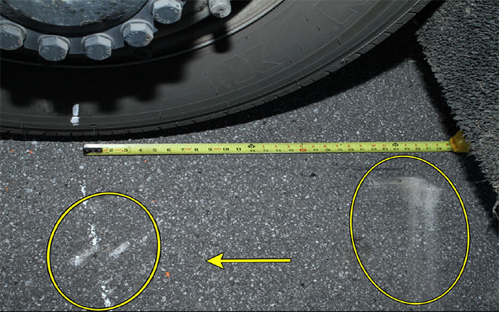 Il y avait de courtes marques de freinage d'environ 3 pouces (7,63 cm) sur le Transitway et elles s'étendaient vers le sud sous les pneus arrière de l'autobus (photo 4).