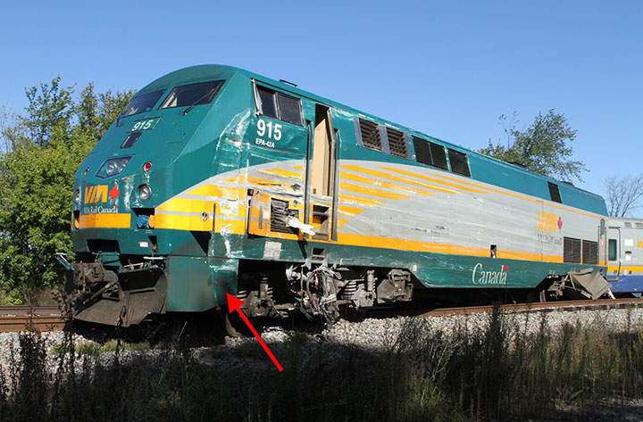 Aucune marque d'impact n'a été relevée sur l'avant du capot de la VIA 915. Le côté gauche du capot court de la VIA 915 présentait une bosselure verticale correspondant au contour du coin avant gauche de l'autobus, étant donné que le coin avant gauche de l'autobus se trouvait tout juste à l'intérieur de la ligne de déplacement de la VIA 915 au moment de la collision.