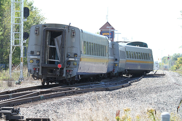 La locomotive VIA 915 (photo 5) et les 4 voitures de voyageurs ont déraillé, mais sont restées à la verticale.