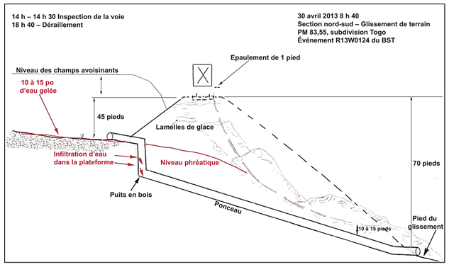 L’affaissement de la plateforme puis l’effondrement du remblai se sont produits dans une courbe vers la gauche de 2,17 ° sur une pente descendante de 0,5 %. Une section d’environ 60 pieds de largeur du remblai qui traverse un petit ravin a glissé. Le pied du glissement se trouvait près de la sortie d’un ponceau de 48 po prévu pour assurer le drainage entre le côté nord et le côté sud de la voie.