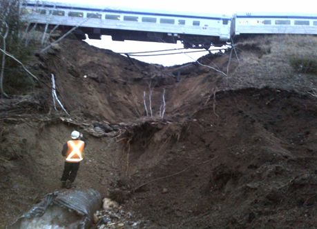 La voie avait été inspectée environ 4,5 heures avant le glissement de terrain. À ce moment, aucun élément apparent n’indiquait un glissement de terrain imminent. Le premier affaissement de la plateforme s’est probablement produit entre l’inspection et l’arrivée du train.