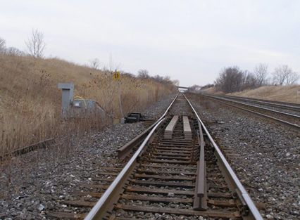 - Un dérailleur à aiguille (photo 2) est un aiguillage de voie installé à l'emplacement du dispositif de déraillement. Le dérailleur à aiguille peut être actionné comme un dérailleur à manœuvre électrique ou comme un dérailleur classique à manœuvre manuelle. Dans les deux cas, le dérailleur est actionné depuis l'extérieur de la voie, tout comme le serait un aiguillage de voie régulier. Cependant, il n'y a pas de voie raccordée à l'itinéraire de bifurcation. Ainsi, quand le dérailleur à aiguille se trouve dans la position de déraillement, les wagons sont déviés directement vers la plateforme.