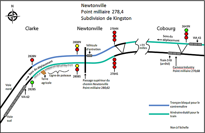 Le train 518 du Canadien National (CN), une manœuvre locale, était en activité près de Cobourg, deux gares à l'est de Newtonville (figure 1). Vers 9 h 53, le contrôleur de la circulation ferroviaire (CCF) a appelé l'équipe du train 518 sur le canal d'attente pour demander qu'elle communique avec le CCF avant de quitter les lieux, afin d'annuler une autorisation. Le train 518 effectuait des manœuvres dans le triage nord à Cobourg, comme c'était la pratique courante pour cette affectation. L'équipe du VIA 62 a entendu la conversation avec le CCF. Vers 10 h 4, après avoir fait annuler son autorisation sur le canal du CCF, le train 518 a quitté Cobourg depuis la voie nord et traversé sur la voie sud, direction ouest, à destination de Cameco Industry (point milliaire 270,68), près de Port Hope (Ontario). L'équipe du VIA 62 ne savait pas que le train 518 était en approche sur la voie sud à partir de Cobourg (figure 1). Vers 10 h 11, l'équipe du VIA 62 a interprété et annoncé le signal intermédiaire (signal 2828S au point milliaire 282,8) comme donnant une indication de vitesse normale (feu vert unique).
