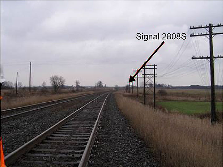 De plus, on a vérifié l'alignement du signal 2808S. À 12 pieds au-dessus du sommet du rail, il a été déterminé que la ligne de visibilité maximale non obstruée pour l'emplacement en question était de 1805 piedsNote de bas de page 11.