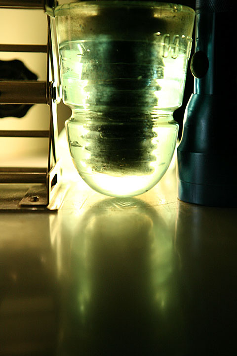 Le Laboratoire du BST a effectué des essaisNote de bas de page 8 sur les isolateurs en verre provenant de la ligne de poteaux du lieu de l'événement (photo 1). Quand une lumière blanche était placée derrière un isolateur vert (photo 2), elle semblait être de couleur verte. De même, quand une lumière blanche était placée derrière un isolateur jaune, elle semblait être de couleur jaune.