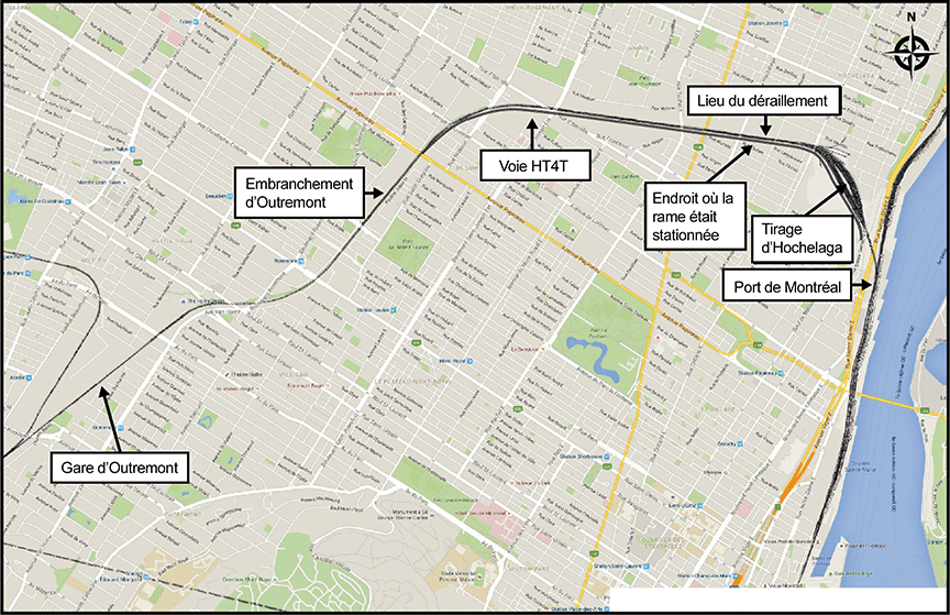 Le 29 octobre 2015, vers 10 h 20Note de bas de page 1, une rame de wagons qui avaient été confiés au Chemin de fer Canadien Pacifique (CP) et immobilisés sur une voie d'entreposage à l'ouest du point milliaire 2,27 de l'embranchement d'Outremont, à Montréal (Québec), s'est mise en mouvement. La rame, partie à la dérive, a roulé environ 120 pieds avant de passer sur un dérailleur à charnière au point milliaire 2,24, ce qui a fait dérailler le premier wagon de la rame. La rame a continué à descendre la pente jusqu'à un dérailleur à aiguille situé environ 400 pieds plus loin, menant au déraillement des 4 wagons suivants. La rame était constituée de 26 wagons à évidement central intermodaux vides. Elle avait une longueur d'environ 4000 pieds et pesait environ 1400 tonnes. Il n'y avait aucun personnel ferroviaire près de la rame, ni engin ni locomotive opérant sur la voie, et aucun mouvement de train n'était prévu dans les environs.