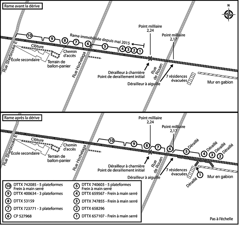 Les 5 premiers wagons de la rame ont déraillé au sud du dérailleur à aiguille du côté ouest de la voie HT4T, obstruant un chemin de gravier privé du CP qui longe la voie. Le wagon DTTX 657107, qui était en tête de la rame, s'est immobilisé perpendiculairement à la voie (figure 2), à environ 500 pieds du panneau de signalisation du dérailleur situé au point milliaire 2,24.