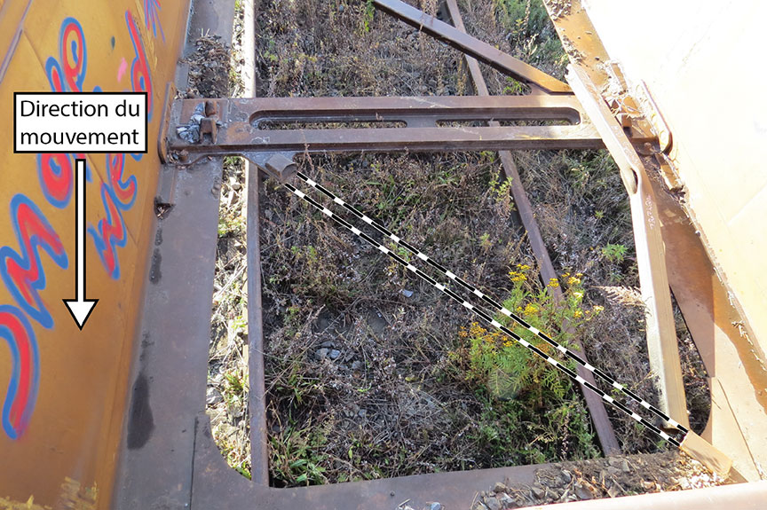 2. Compte tenu de la hauteur de certains dérailleurs à charnière, leur utilisation sur des voies où sont entreposés des wagons à faible dégagement inférieur n'est pas un moyen de défense physique adéquat pour réduire la gravité d'un accident en cas de mouvement non contrôlé.