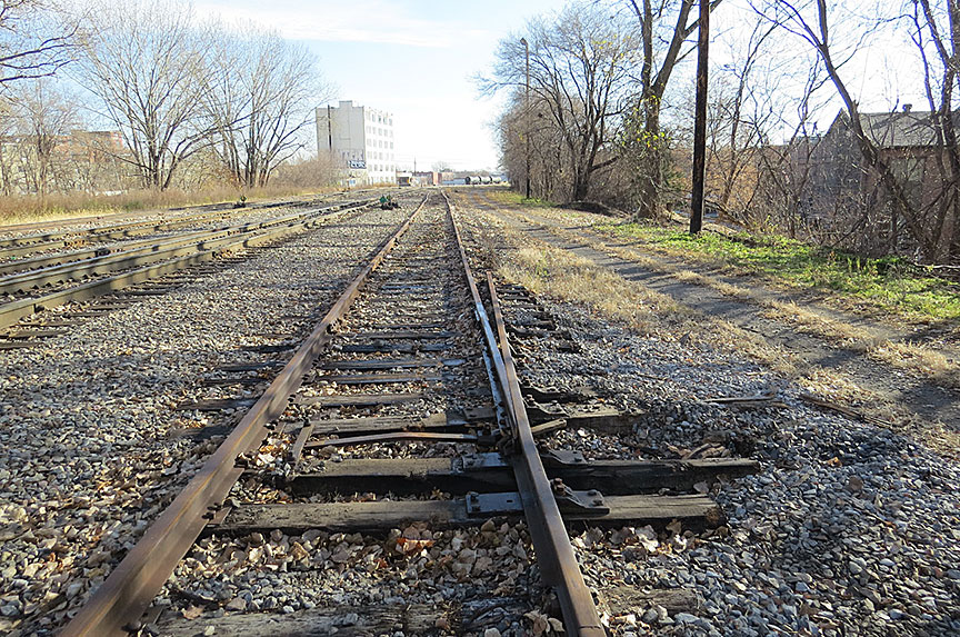 Dans la zone du déraillement, la voie HT4T a une orientation nord-sudNote de bas de page 3 et une pente descendante de 1,60 % vers le port de Montréal. La portion sud de la voie comportait 2 dérailleurs—le premier, à charnière, situé au point milliaire 2,24 et l'autre, à aiguille, situé près du point milliaire 2,17. Un autre dérailleur à charnière était installé plus au nord, au point milliaire 3,10.