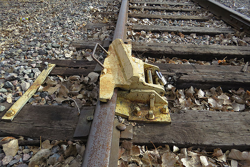 • Un dérailleur à charnière est formé d'un bloc fixé aux traverses qui doit être basculé manuellement sur le dessus de la surface de roulement du rail pour être en position de déraillement. Cet appareil est utilisé contre des mouvements à basse vitesse. Lorsqu'un dérailleur à charnière est en position de déraillement, sa hauteur est de 9½ pouces à partir du dessus des traverses de bois et il dépasse du rail d'environ 3 pouces (photo 4).
