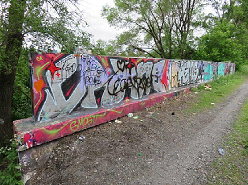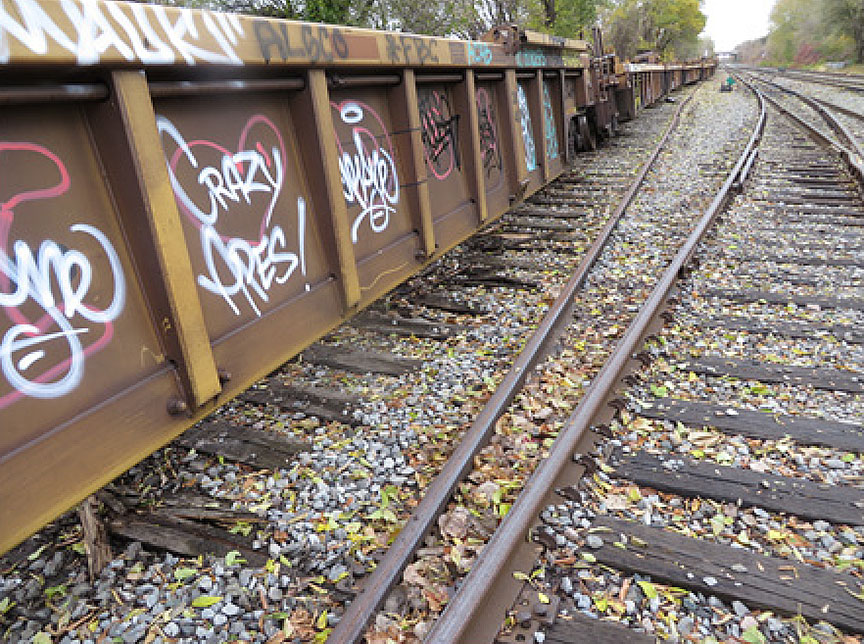 Il y avait des cannettes de peinture en aérosol et des bouteilles vides sur l'emprise ferroviaire. De plus, des graffitis avaient été peints sur la plupart des wagons, des ouvrages d'art ferroviaires et des bâtiments voisins (photo 7 et photo 8). Les membres du personnel ferroviaire ont indiqué qu'ils croisaient régulièrement des intrus et que les clôtures exigeaient des travaux perpétuels, car de nouvelles ouvertures apparaissaient aussitôt que les anciennes étaient réparées.