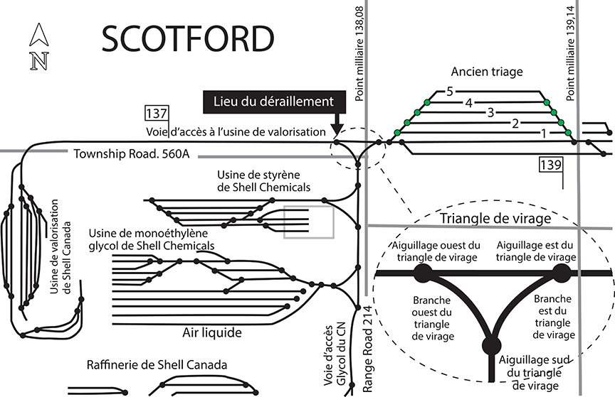 - Le déraillement est survenu lorsque le mouvement a franchi en marche arrière l'aiguillage ouest du triangle de virage, qui était endommagé.