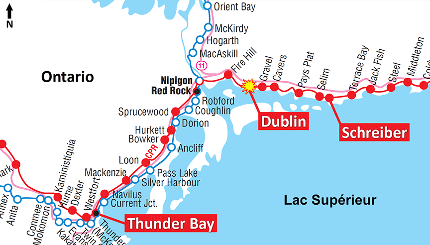 La subdivision de Nipigon du CP est formée d'une voie principale simple allant de Schreiber (Ontario), point milliaire 0,0, vers l'ouest jusqu'à Thunder Bay (Ontario), point milliaire 132,9. Les mouvements de train sur la subdivision sont régis par le système de commande centralisée de la circulation (CCC), autorisé par le Règlement d'exploitation ferroviaire du Canada (REF) et supervisé par un CCF en poste à Calgary (Alberta).