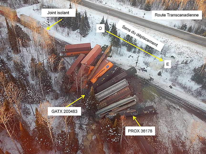- Le 31e wagon, DTTX 646929, était debout, avec ses 2 bogies déraillés, au sud de la voie; il était encore attaché à la queue du train.