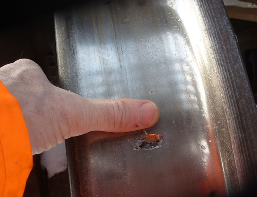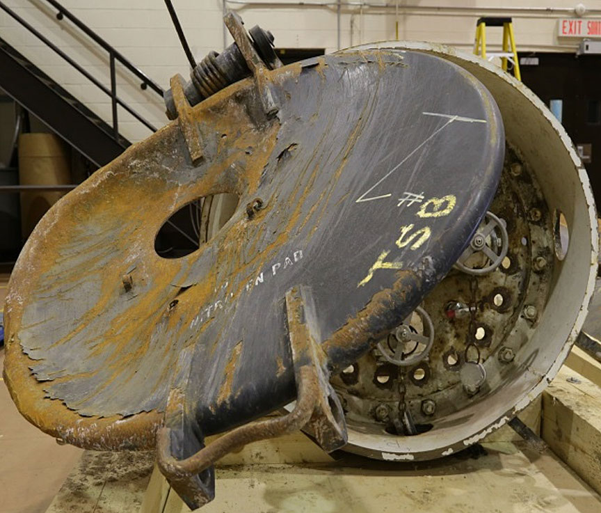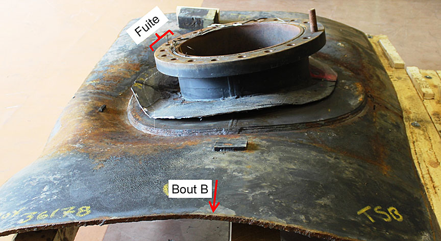 - Un coupon de citerne comprenant la perforation et des portions représentatives des matériaux de la tête et de la coque environnantes a été découpé du wagon-citerne GATX 200483 et envoyé au laboratoire du BST pour y subir un examen exhaustif.